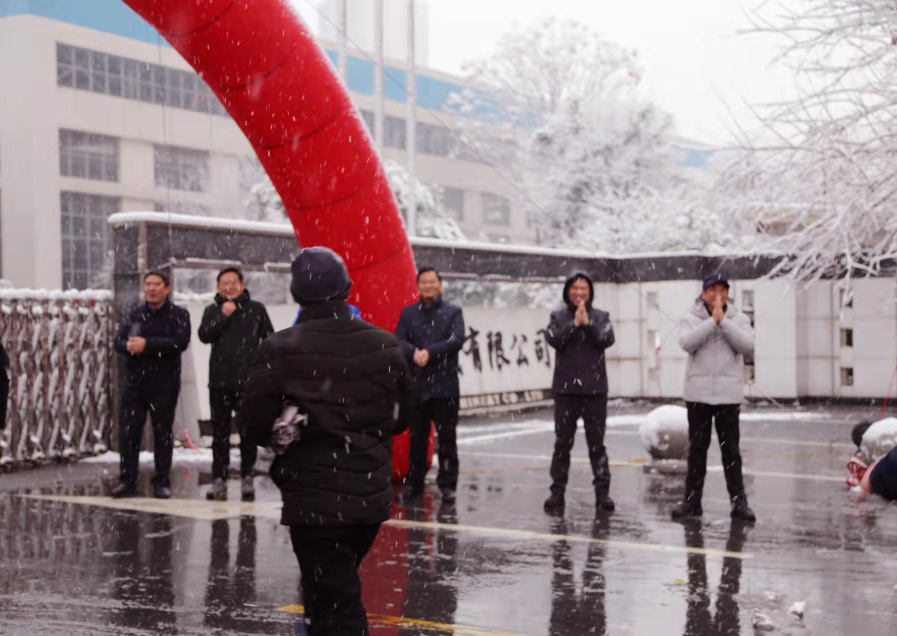早晨8:38分,董事长潘荣敦、总经理彭宜纯率全体公司领导冒雪守候在公司大门口,恭迎春节第一天前来上班的员工并祝贺新年。随后公司还为每位员工分发了预示新年红红火火的大红包。