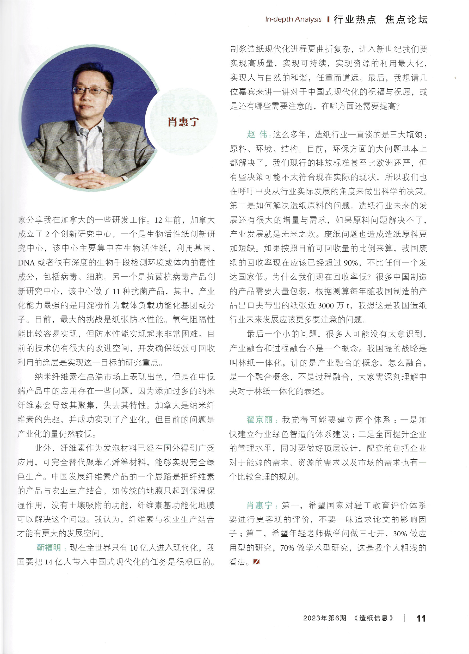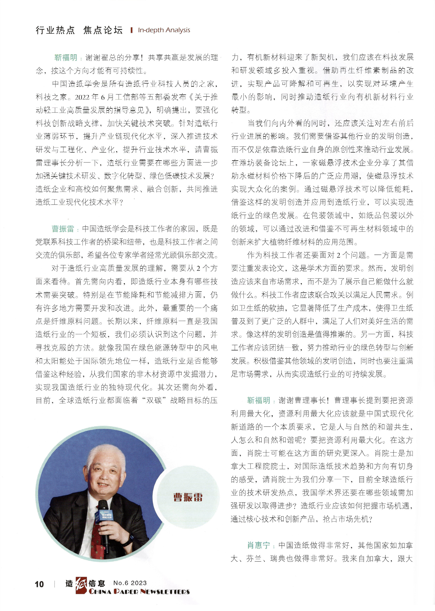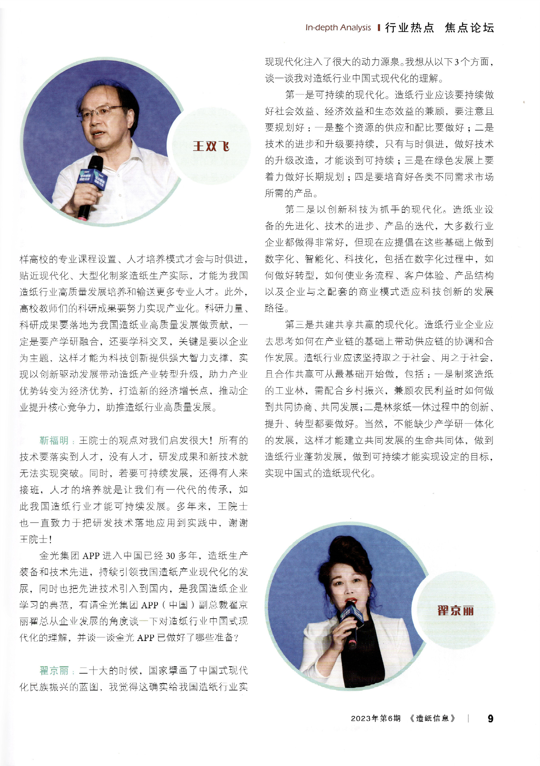 主题为“造纸行业中国式现代化新道路”的高峰对话由中国中轻国际工程有限公司技术总监靳福明 主持,特邀中国造纸协会理事长赵伟,中国造纸学 会理事长曹振雷,中国工程院院士、广西大学教授 王双飞,加拿大工程院院士、加拿大新布伦瑞克大学教授肖惠宁、金光集团 APP(中国)副总裁翟京丽 5位重量级嘉宾,从我国造纸行业如何应对新时期市场竞争环境、如何创新发展和转型升级、如何高质量发展及如何可持续发展等不同视角,着重探讨与分享了关乎我国造纸行业长远发展的精彩内容。